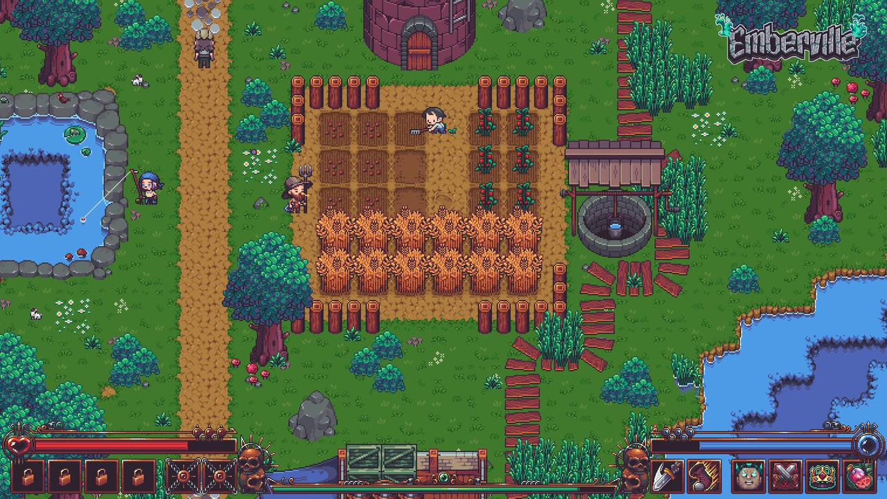 Emberville intègre également une zone créative où les joueurs peuvent construire, décorer, cultiver et installer des équipements d’artisanat. Cette zone évolutive permet de développer des compétences, de produire des objets ou simplement de se détendre. Pour faciliter la gestion des ressources et des outils, l’interface utilisateur s’adapte dynamiquement en fonction de l’activité en cours (combat, pêche, agriculture, etc.).
