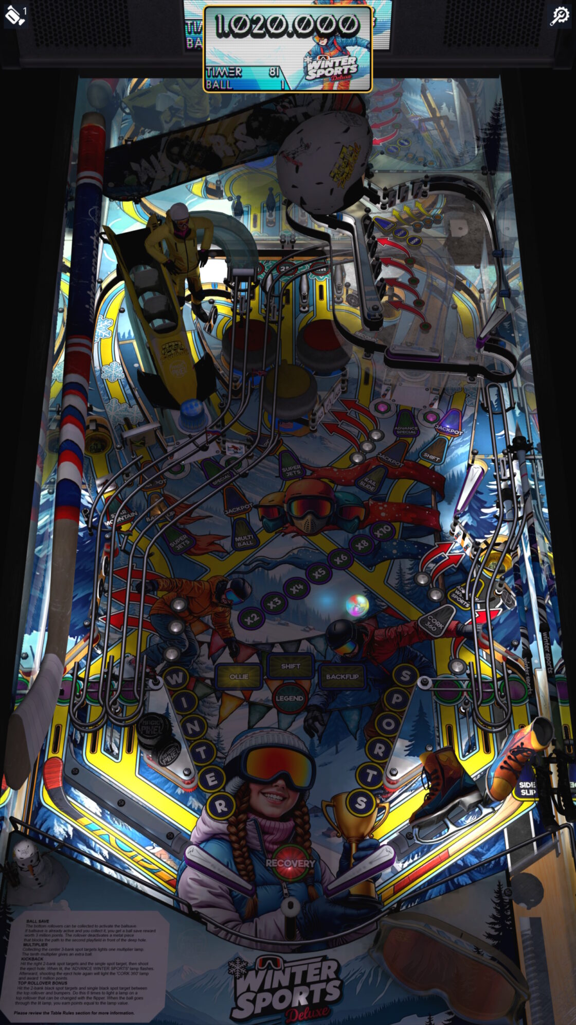 Les rampes et trajectoires sont disposées de manière à rappeler les disciplines sportives : descentes rapides, virages serrés et zones de tir qui évoquent des pistes enneigées. La circulation de la bille est fluide et nerveuse, donnant au jeu un rythme soutenu. Chaque tir semble pensé pour offrir une sensation de glisse et le plateau encourage à explorer ses différentes zones pour maximiser les points.