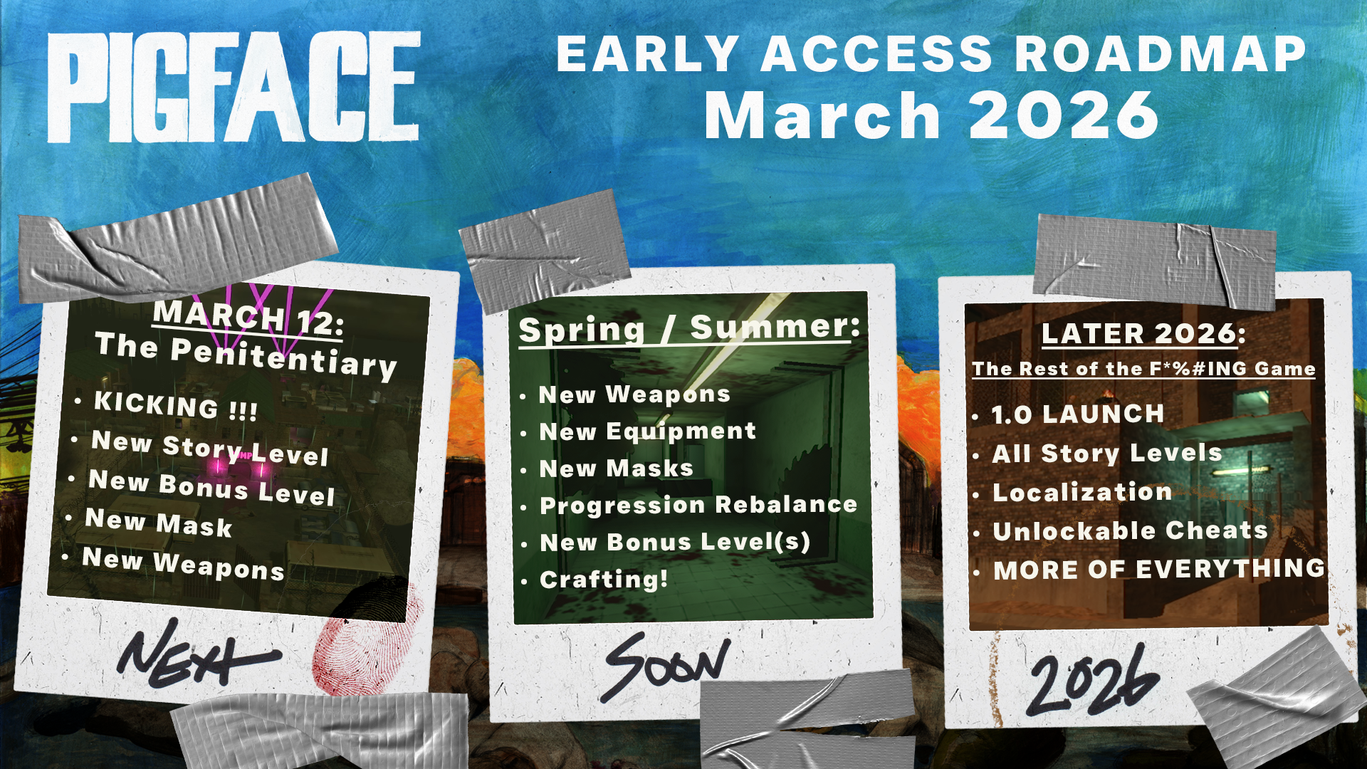 La Penitentiary & Kicking Update introduit un ensemble de contenus supplémentaires, de nouvelles mécaniques et plusieurs améliorations destinées à faciliter l’expérience de jeu. Depuis son arrivée en Accès Anticipé, PIGFACE a été remarqué pour son esthétique, la variété de ses armes et la flexibilité de ses styles de jeu, ce qui lui a valu une évaluation très positive sur Steam.