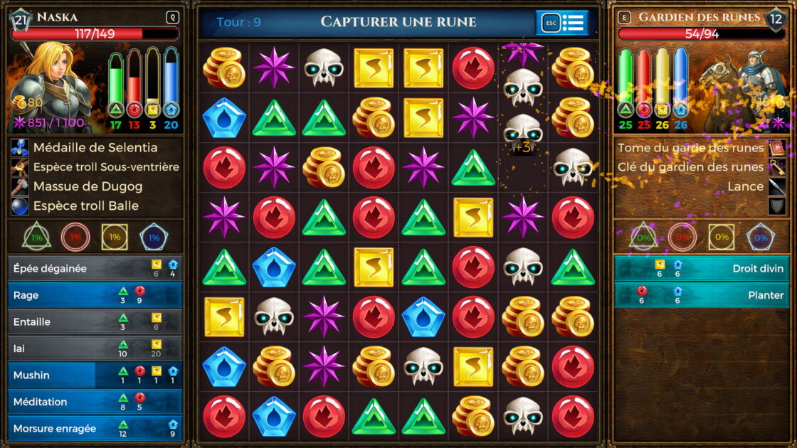 On va naviguer sur la map, avec beaucoup d’aller-retours pour glaner des missions comme traquer un artefact volé ou purger un nid de gobelins. Ensuite, on va plonger dans des batailles dans lesquelles l’on aligne des gemmes sur une grille 8×8 pour accumuler mana, or, xp et frappes.