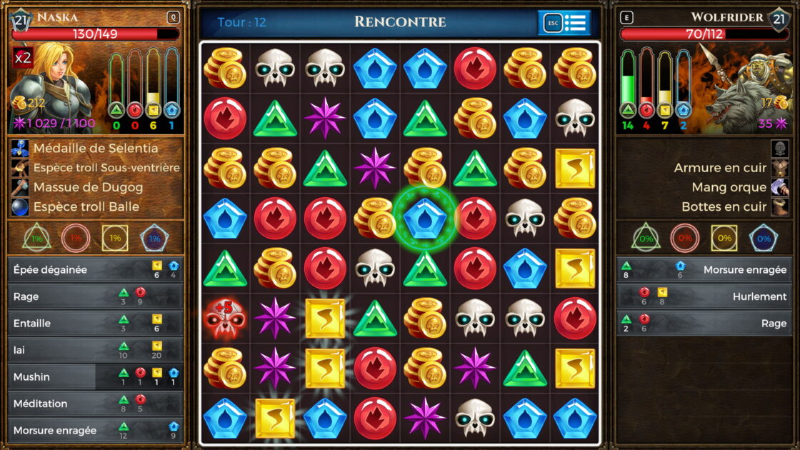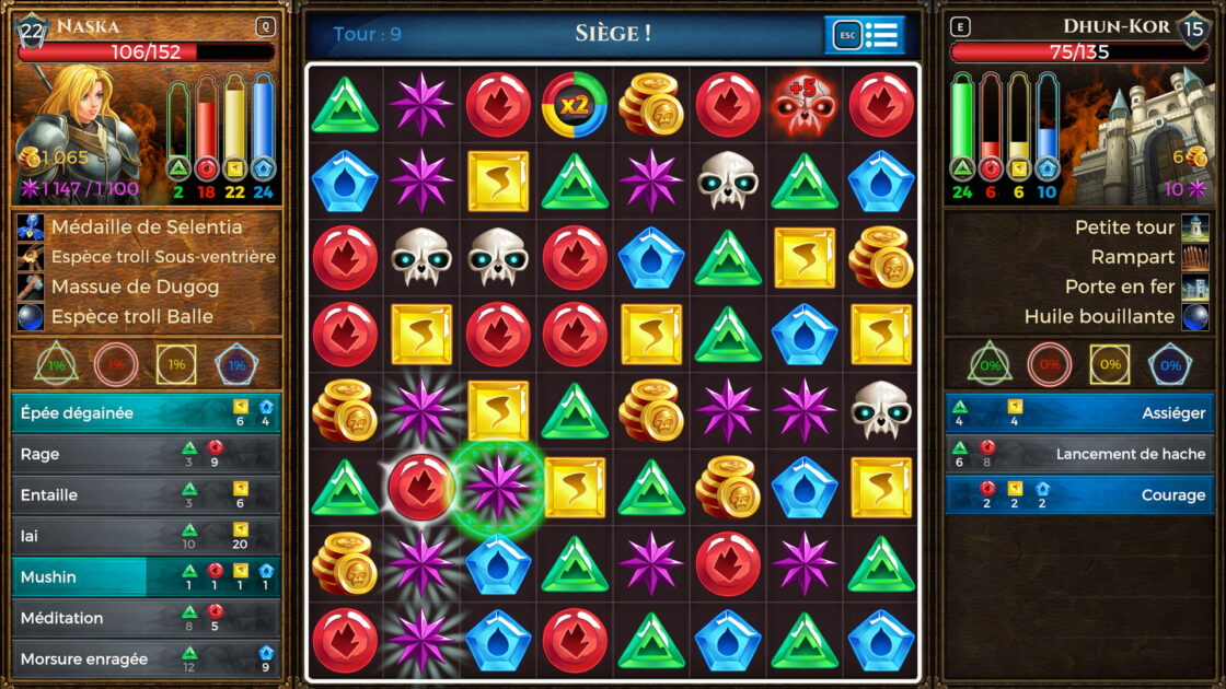 Les règles sont limpides : matcher trois joyaux ou plus d’une couleur remplit le réservoir correspondant. On ne peut déplacer qu’une seule gemme par tour horizontalement ou verticalement. Il y a quatre gemmes de couleurs différentes (jaune, vert, bleu et rouge), des gemmes d’or et d’xp. Si on aligne quatre gemmes identiques, on gagne un tour et avec cinq, un joker apparait pour booster le remplissage des couleurs.