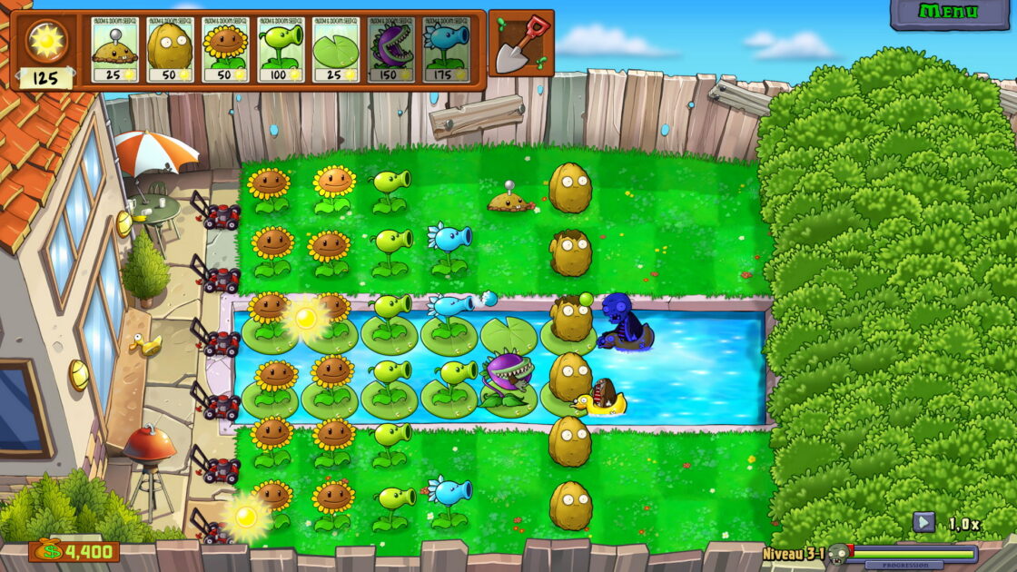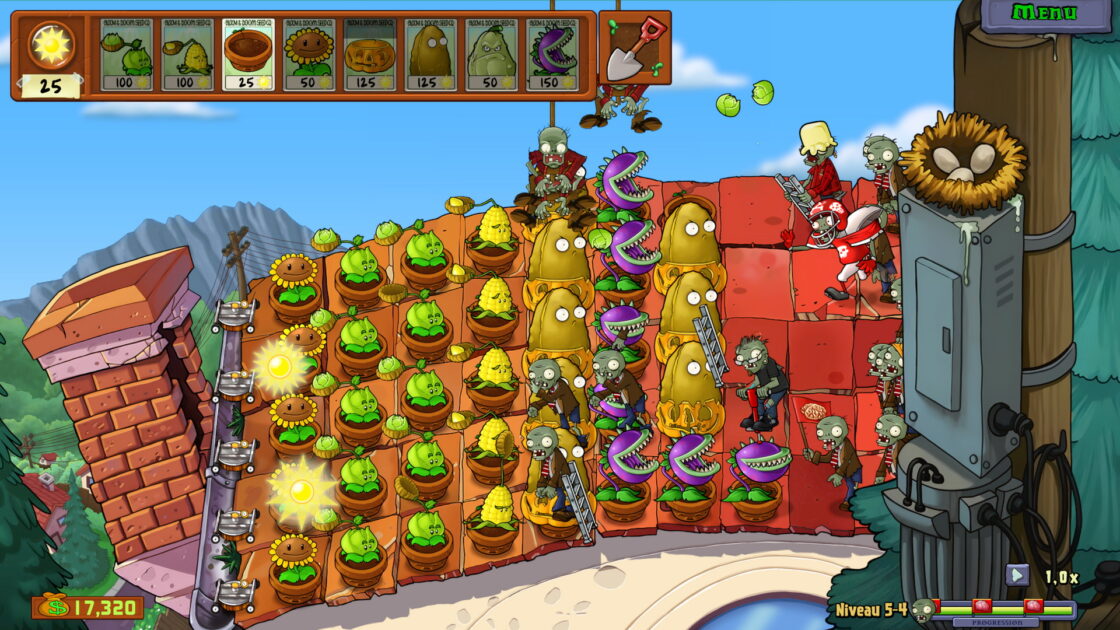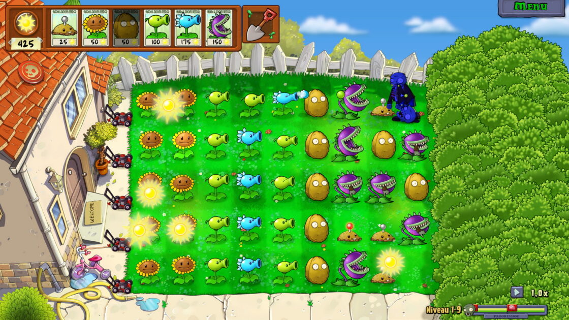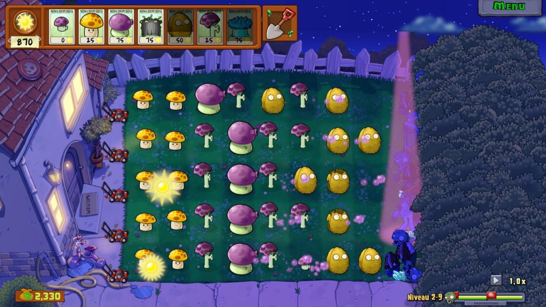 Ici, on défend sa maison de vagues de zombies affamés en plantant des végétaux offensifs et défensifs sur cinq allées. L’aventure solo se déroule sur une cinquantaine de niveaux répartis en cinq mondes thématiques : jour, nuit, piscine, brouillard et toit.