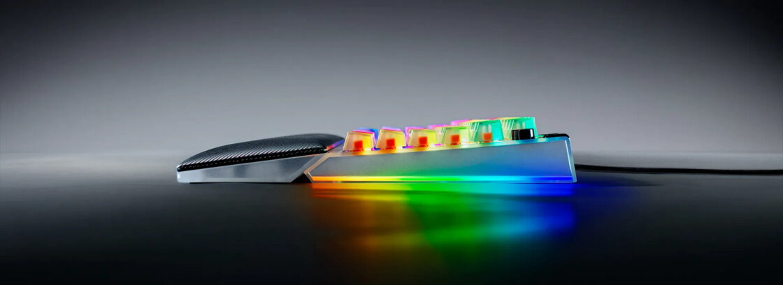 Cette édition Phantom White diffuse la lumière avec une plus grande intensité, car les touches en ABS double-shot sont translucides. Le RGB prend tout son sens sur ce fond blanc. Et cela renforce l’ambiance visuelle selon le jeu.