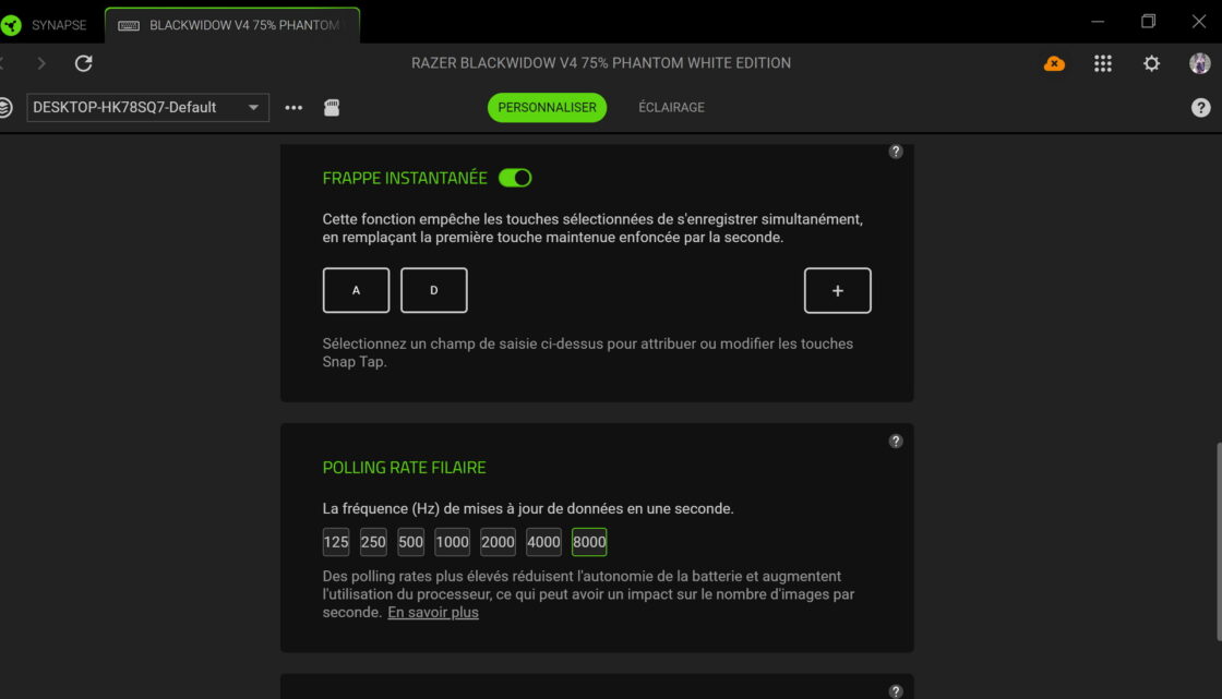 On a la possibilité de déployer le Snap Tap pour prioriser les inputs en mouvement comme les A-D spam en Counter-Strike 2 et créer des profils par application qui switchent automatiquement. Ce qui est utile pour passer d’un setup gaming en Overwatch à un mode bureautique en Excel.