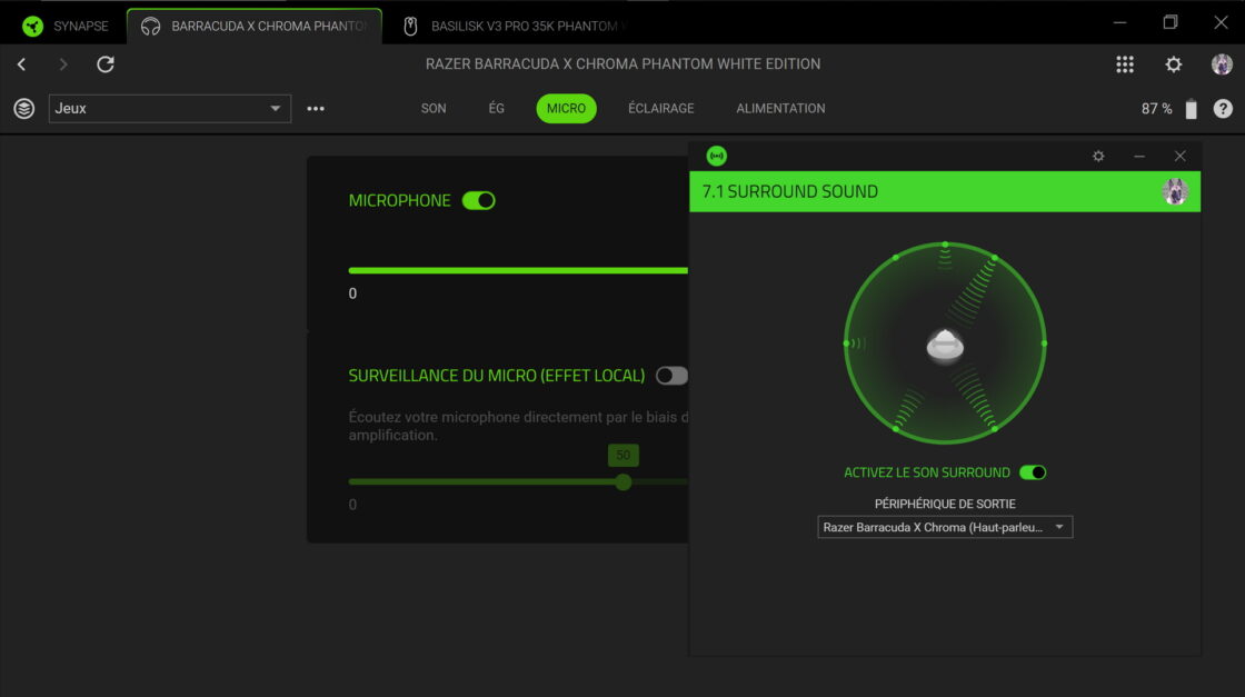 Cela dit, si on choisit d’acheter le logiciel THX Spatial Audio et de le coupler avec ce Razer Barracuda X Chroma, on peut déjà franchir un cap significatif sans changer de casque. Ce logiciel ajoute une couche de spatialisation avancée qui dépasse le surround 7.1 standard, en simulant des sources sonores sur tous les axes, y compris en hauteur.