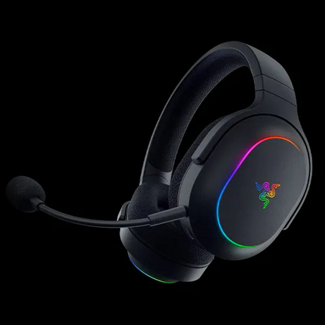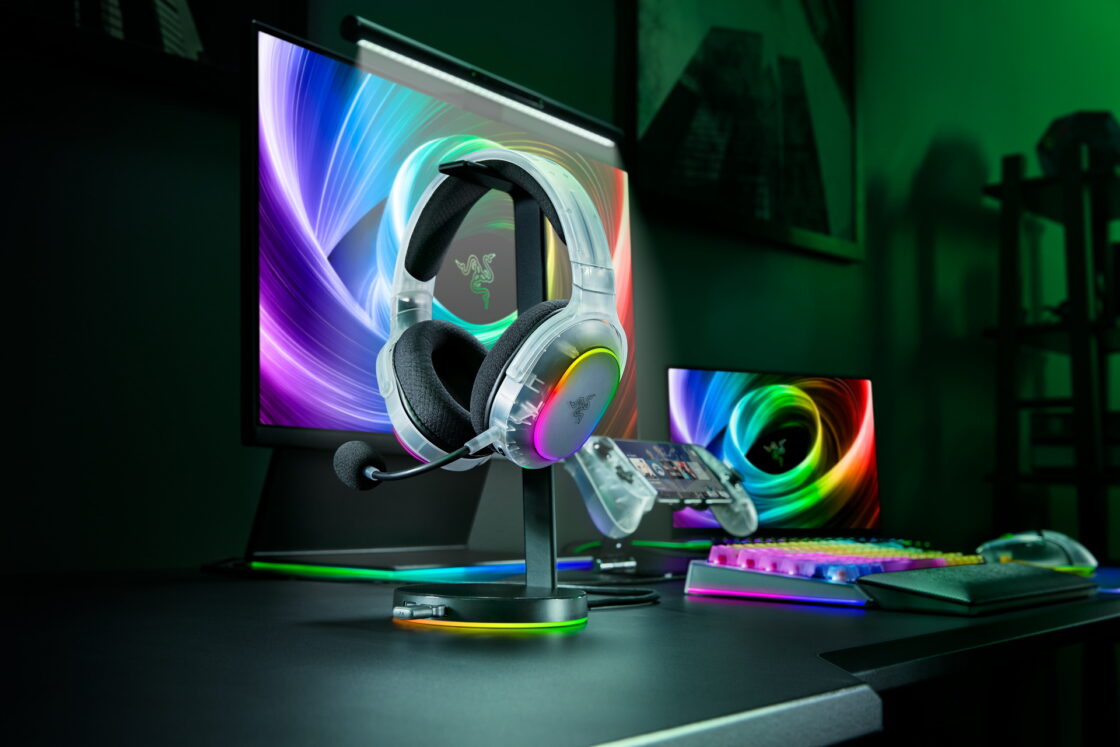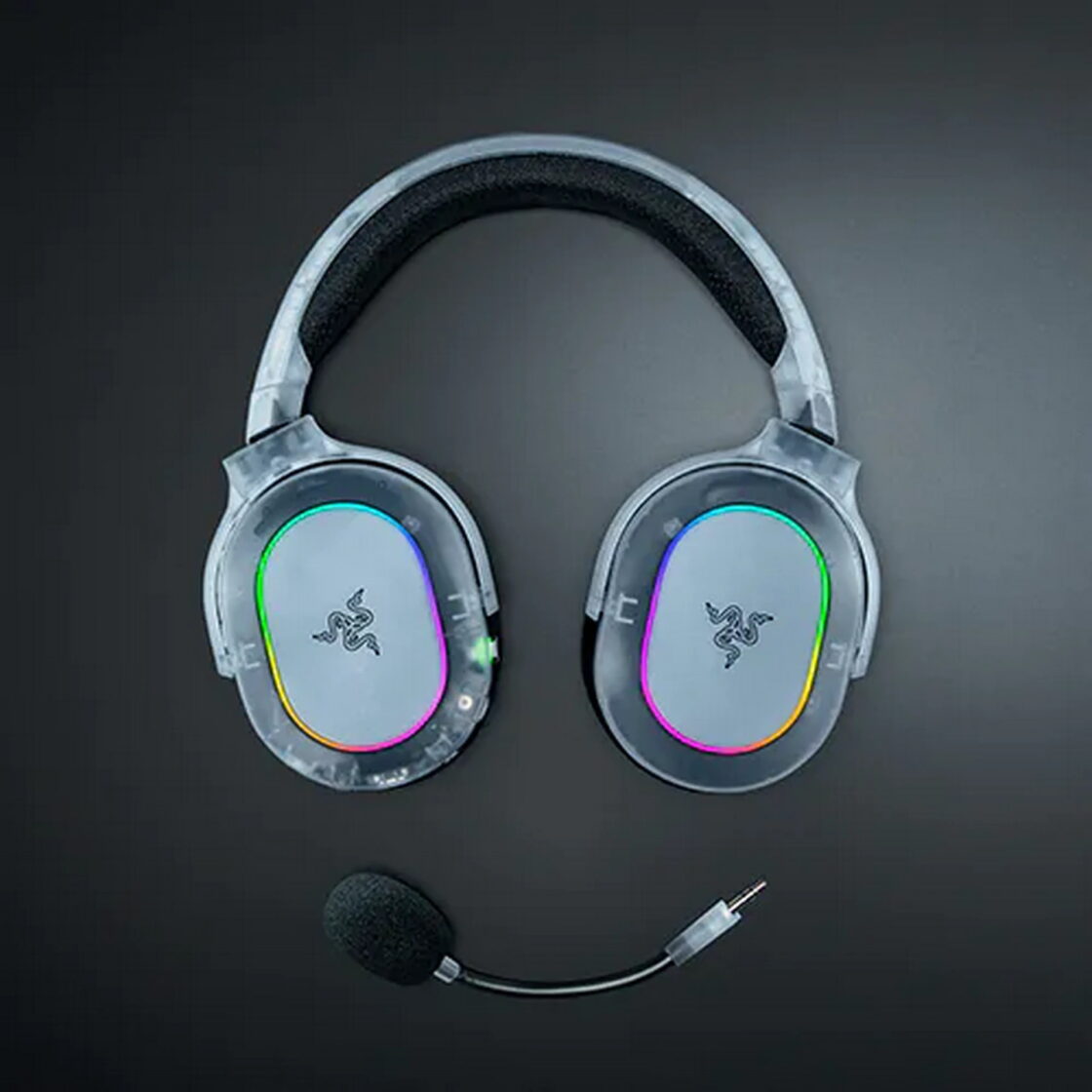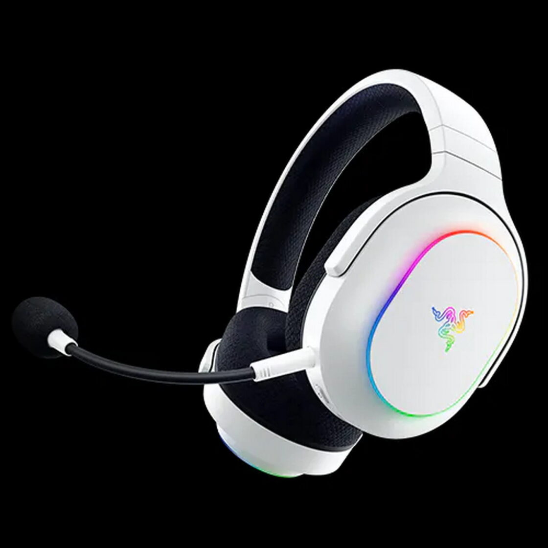 Le logo Razer discret sur les oreilles et le nom de la marque en gros sur l’arceau, assortis à la teinte claire, et l’éclairage RGB à six zones subtilement diffusé ajoutent une touche de modernité.