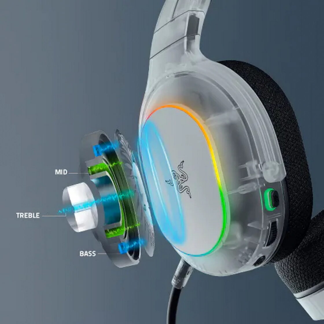 Lorsque le RGB est activé, l’esthétique prend une toute autre dimension. Les six zones d’éclairage Chroma RGB sur les oreillettes diffusent une lumière douce et personnalisable qui contraste élégamment avec le blanc translucide du casque.
