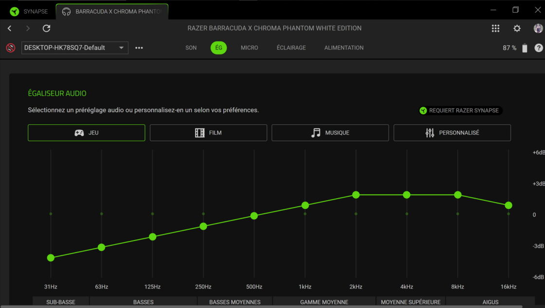 Côté logiciel, le Barracuda X Chroma ne propose pas de réglage avancé du micro via Synapse. Il n’y a pas d’égaliseur vocal, de compression, ni de filtre anti-pop numérique intégré. Cela limite les possibilités de personnalisation pour les streamers ou les joueurs compétitifs qui souhaitent affiner leur rendu vocal.