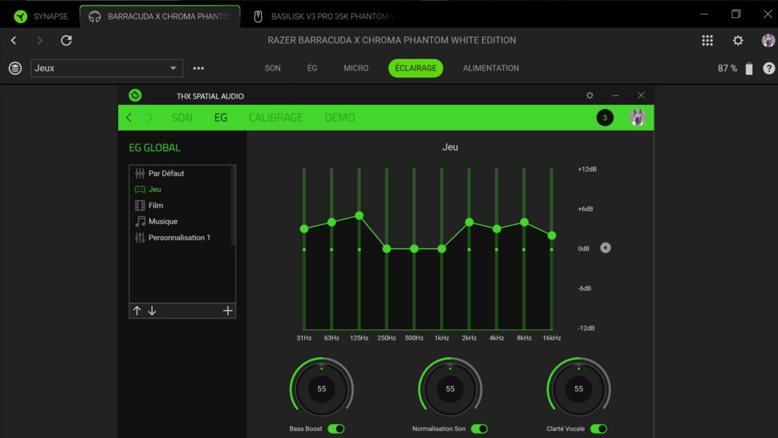En plus de cette immersion sonore, THX offre des réglages avancés pour personnaliser l’environnement audio selon le type de contenu (jeu, film, musique), avec des profils optimisés et une gestion fine de l’égalisation. J’aime bien la fonction permettant de déclencher rapidement le Bass Boost, la normalisation du son et la clarté vocale.
