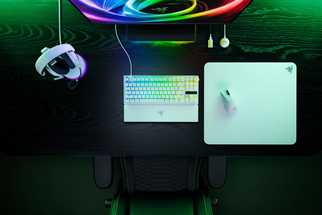On a la possibilité de le synchroniser avec tous les périphériques Razer Chroma-enabled. Ce qui permet d’obtenir un effet lumineux uniforme sur l’ensemble du setup, avec des transitions fluides et des animations coordonnées.
